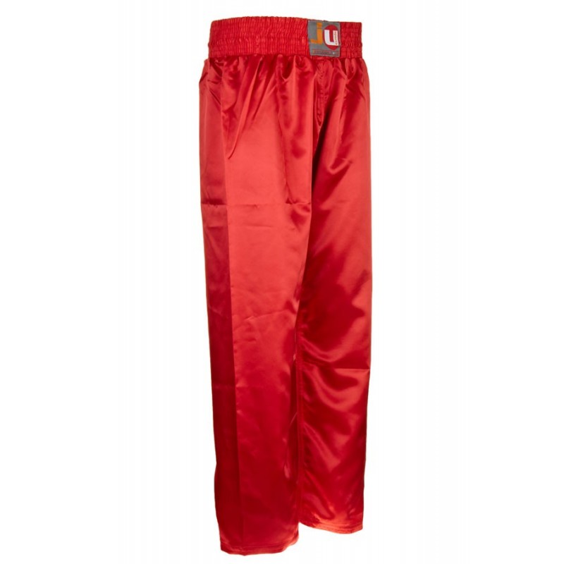Kickboksbroek van satijn (100% polyester) in klassieke snit, met elastiek bovenaan en extra vetersluiting.
